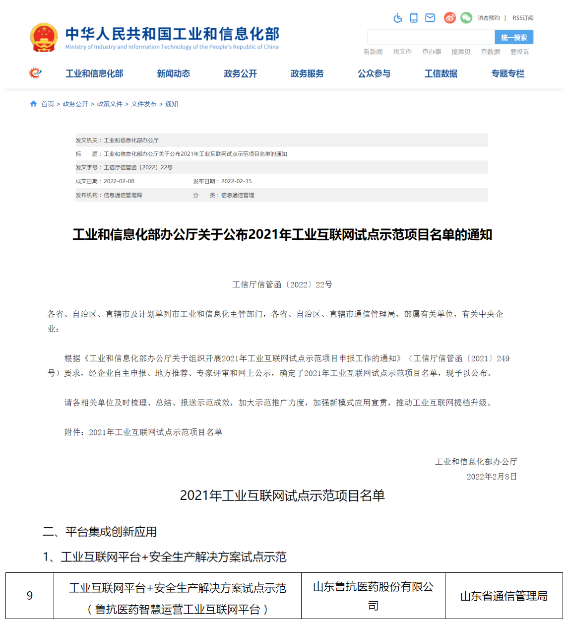 近日,工业和信息化部办公厅正式公布2021年工业互联网试点示范项目名单,信誉至上金年会集团旗下鲁抗医药智慧运营工业互联网平台入选,是省内唯一一家入选的医药企业。